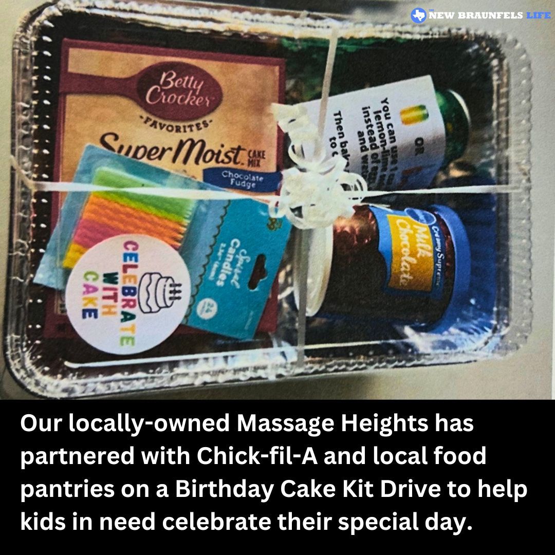 This April, Massage Heights in New Braunfels is teaming up with Chick-fil-A and local food pantries to bring birthday celebrations to kids who need it most. They’re collecting Birthday Cake Kits filled with essentials like cake mix, frosting, candles, pans, and decorations, everything needed to make a child’s day feel special.