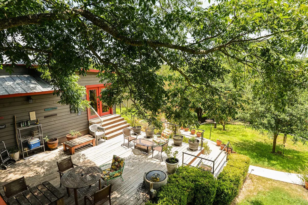 If you’re ready to unplug, Harmony House in Bastrop delivers. This cozy A-frame river retreat sleeps up to four and features a queen bed, loft with twin beds, kitchenette, Smart TV, and high-speed Wi-Fi. Step outside and you’ll find eight themed patios, zen hammocks, lush gardens, and direct access to the Colorado River, all just two miles from downtown Bastrop and about 35 minutes from Austin.